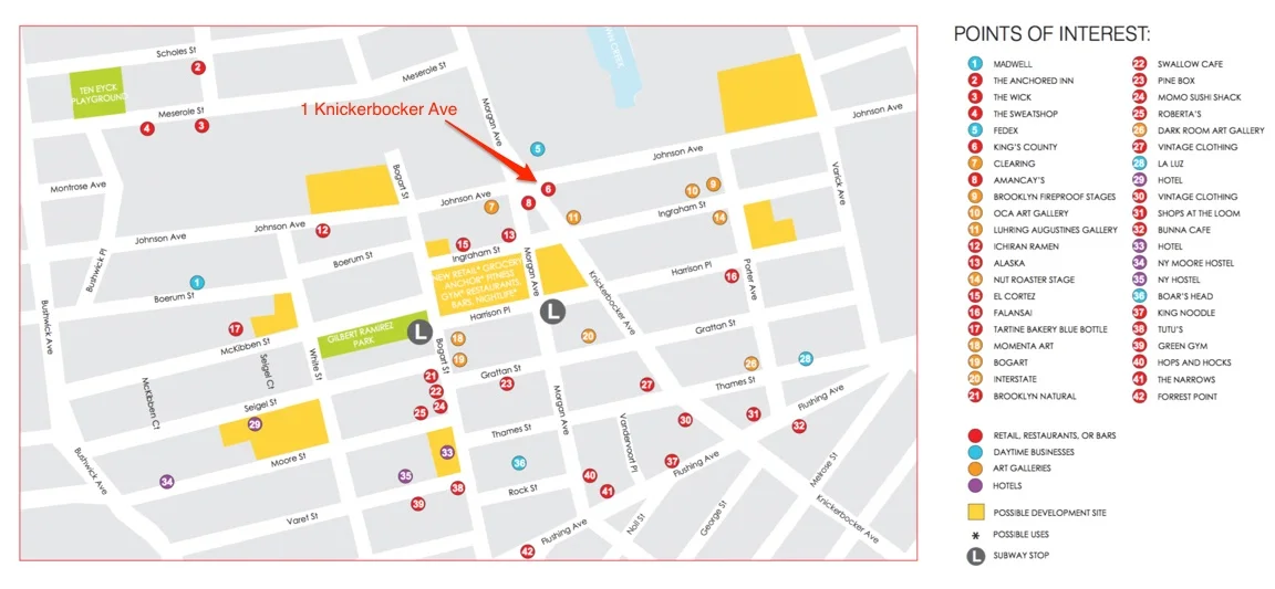 - Neighbors: Pine Box Rock Shop, BogArt, Roberta's, Blanca, Momo Sushi Shack, Swallow Cafe, Shinobi Ramen, Falansai, Boar's Head, Tutu's, NY Loft Hostel, El Cortez, Hops&Hocks, Narrows, King Noodle, Crossfit, Supercrown, Little Whiskey, Green Gym, and many known brands slated to open.